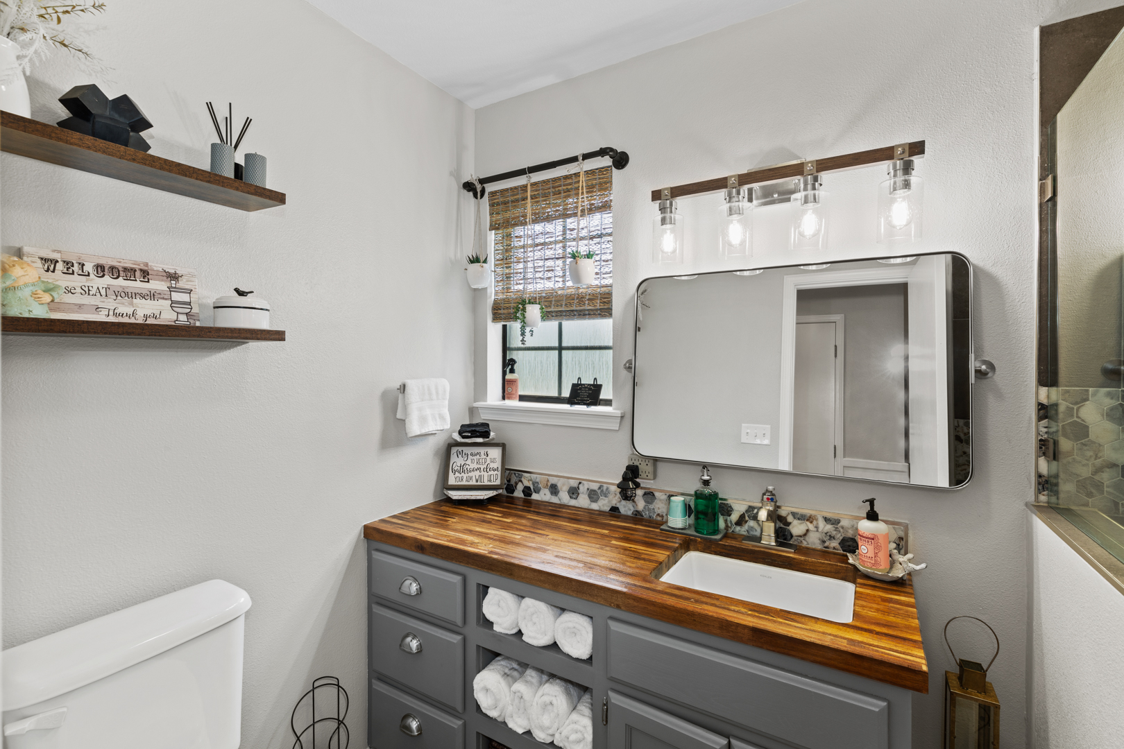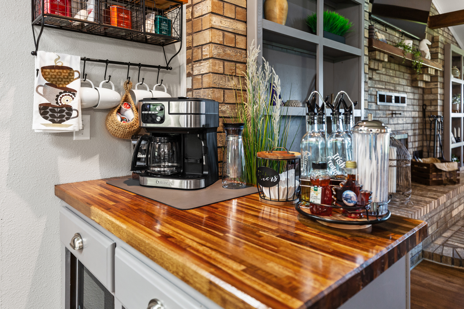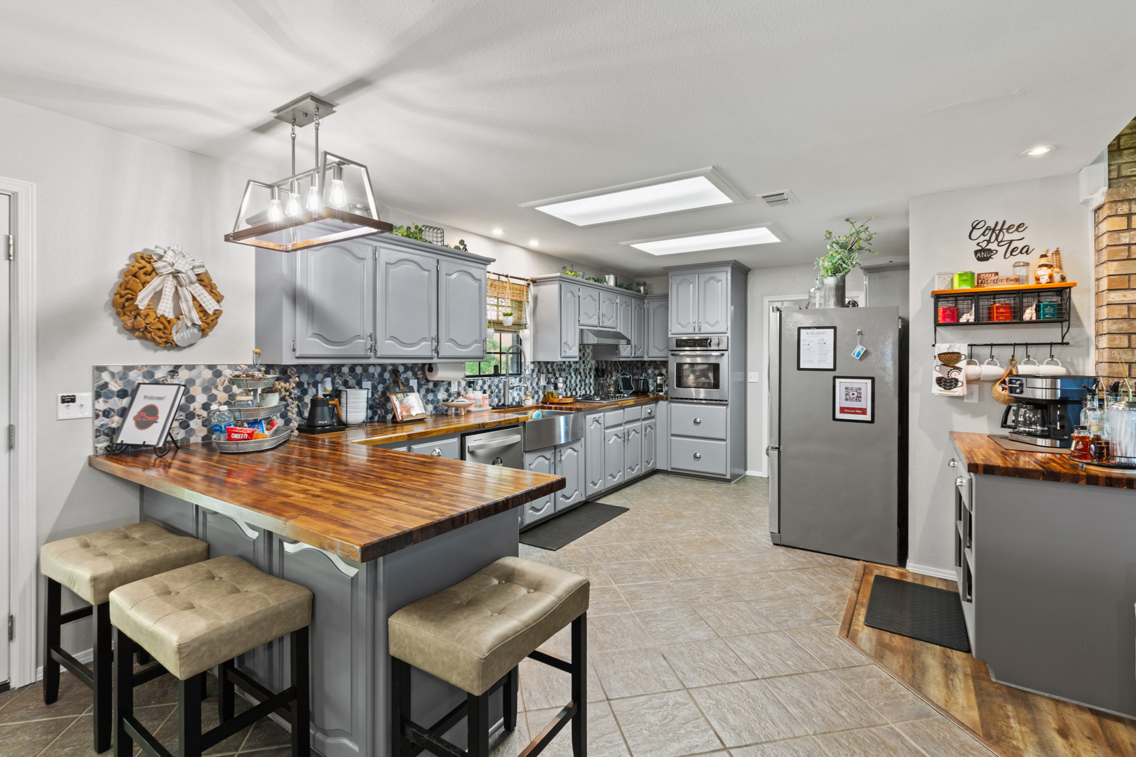 Modern kitchen with stainless appliances, butcher-block countertops, coffee bar, and farmhouse sink