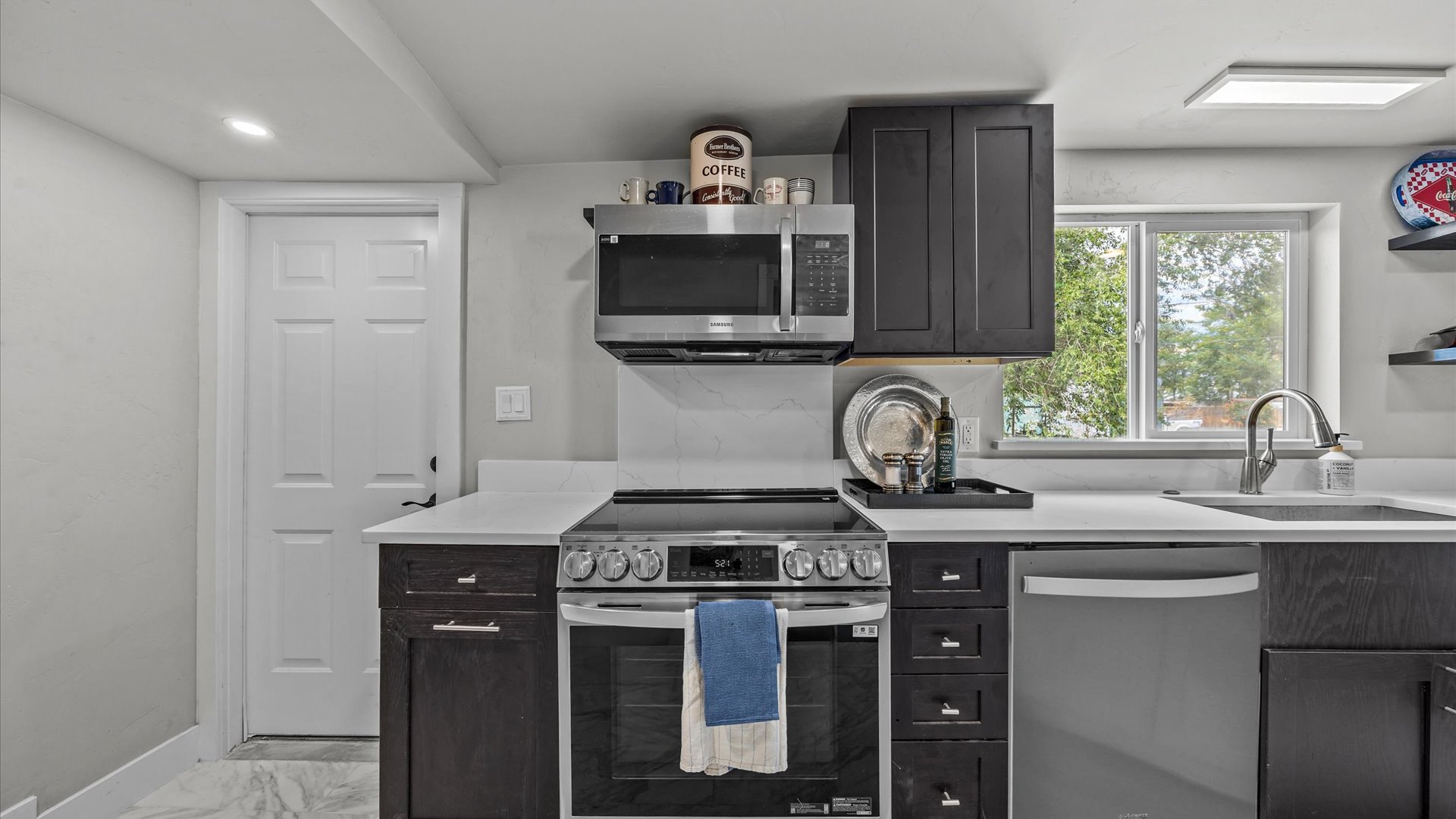 The inviting entryway flows seamlessly into a light-filled living space. The kitchen features elegant quartz countertops, stainless steel appliances, and stylish cabinetry—perfect for everyday living and entertaining.