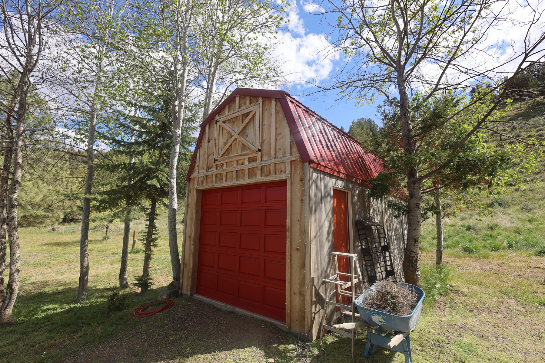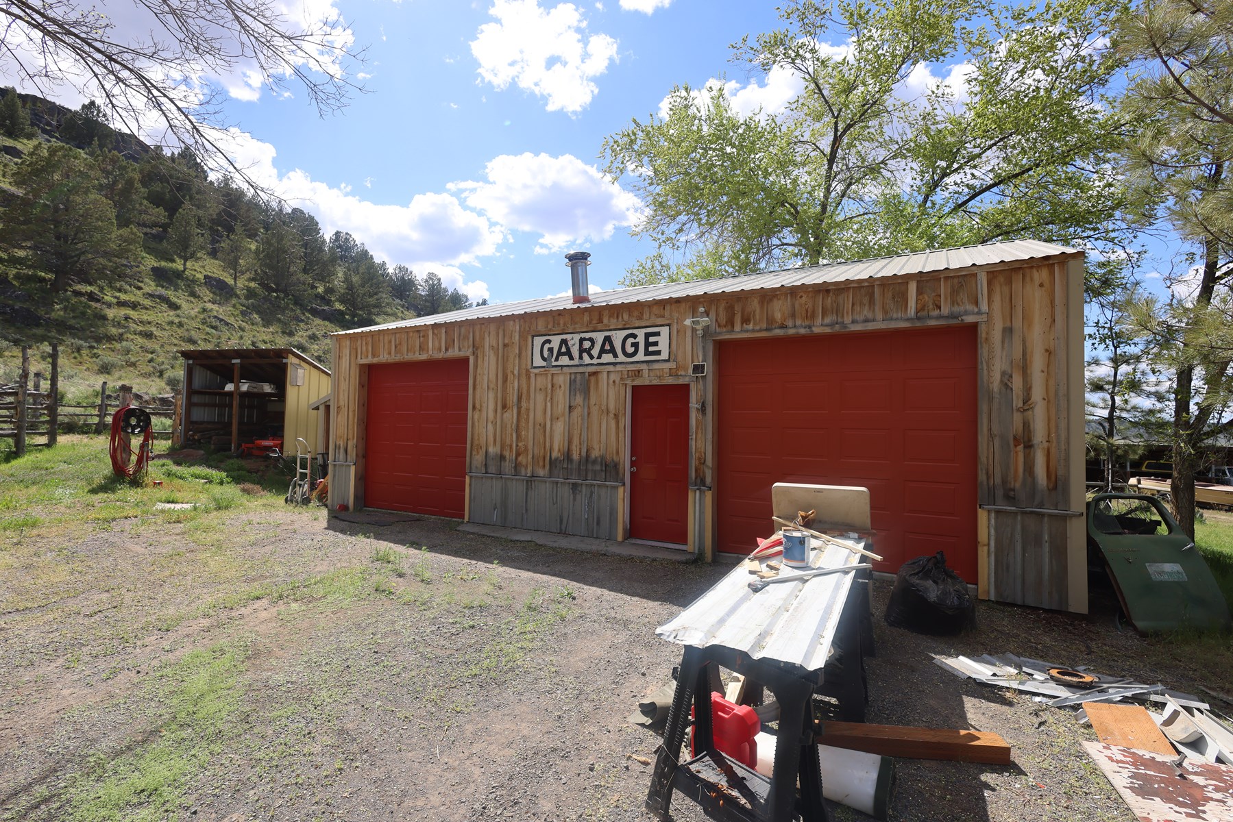 • A garden area is enclosed by a game fence to keep mule deer in the area out.  Multiple raised garden beds are currently planted in peas, lettuce, onions, & more.  Next to the area is a small shed that is used for firewood.  Owner to take a few raised garden beds.