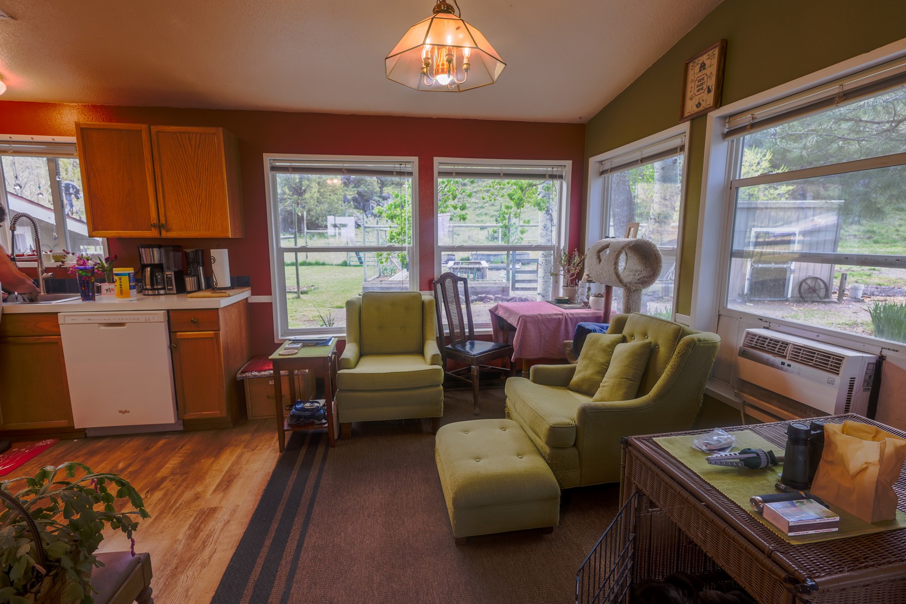 The home features a spacious 2 bedroom, 1.75 bath with an enclosed back addition.  The front is partially covered with great views overlooking the pasture ground.  Inside is a galley kitchen, pantry space, a private master suite, & more with laminate floor spanning the home.  Out back behind the home is an enclosed garden with raised garden beds, rhubarb plants, chicken coop and an orchard consisting of apple, pear, & plum trees.