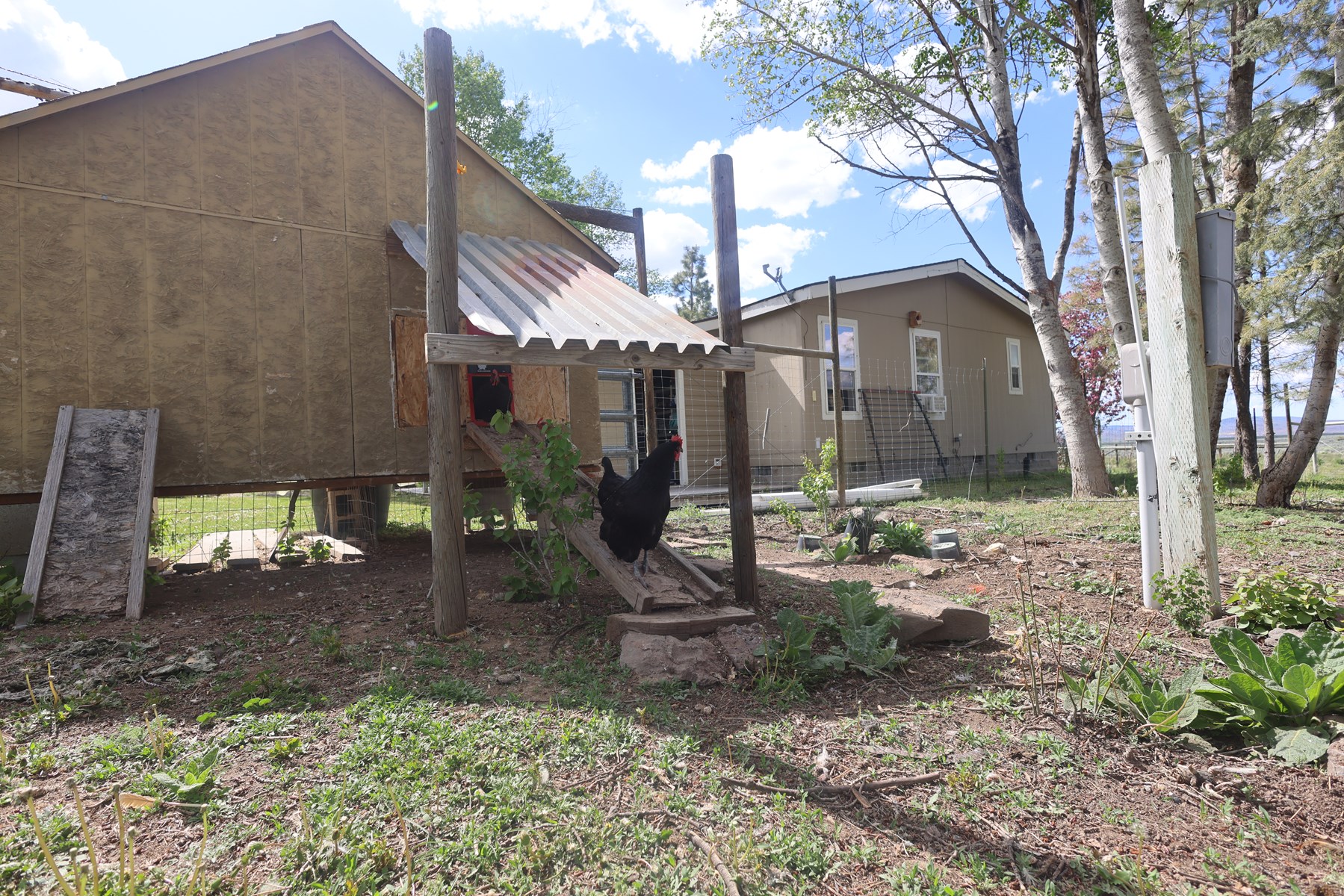 • The chicken coop is fenced in with fruit trees including apple, pear, & plum.