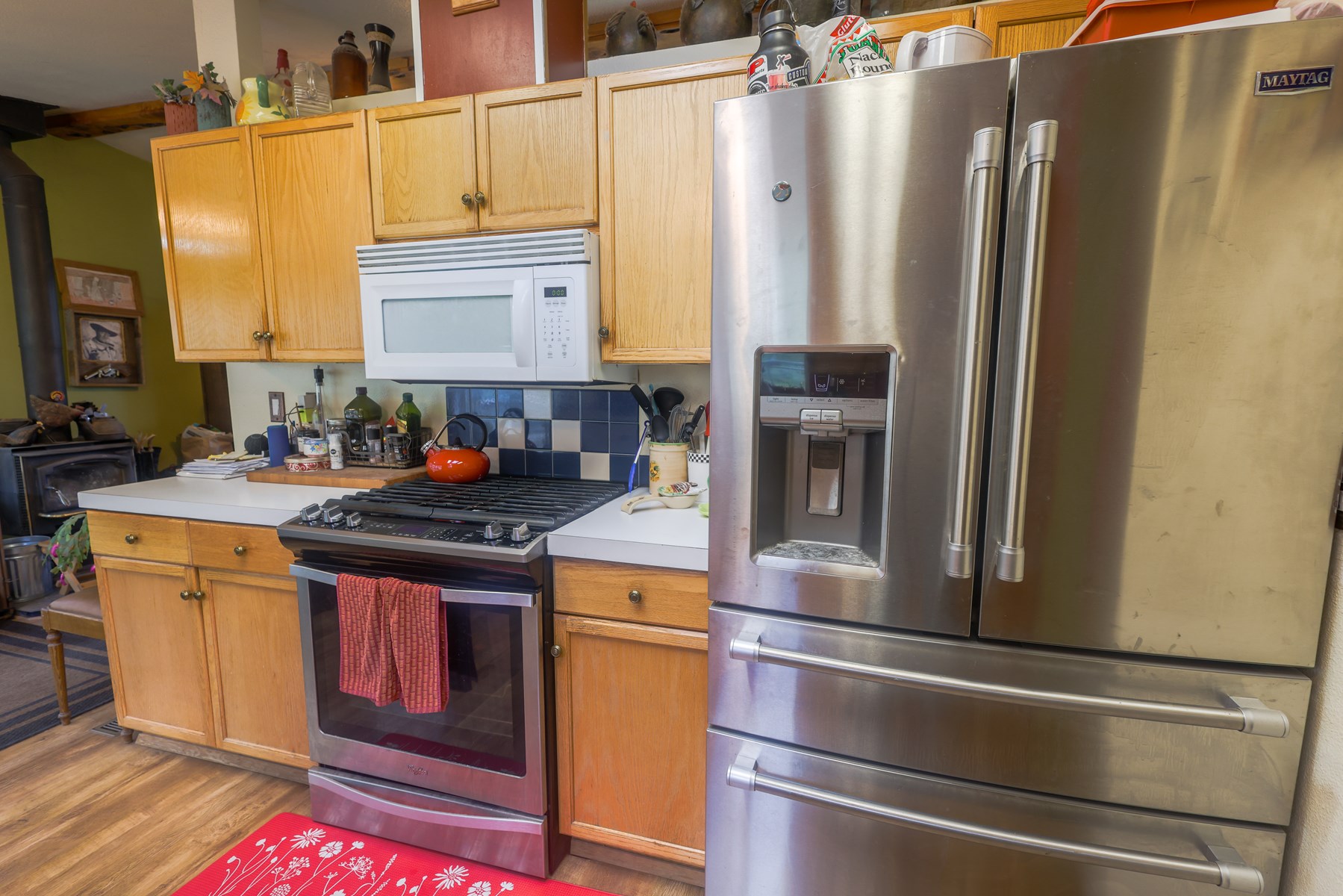When you enter laminate flooring runs throughout the entire home with vaulted ceilings.  The family room has a woodstove to provide additional heat along with the electric F/A furnace.  A galley kitchen is located off the family room with ample cabinet space, dishwasher, electric or gas range, refrigerator, & microwave.  Through the kitchen is an extra storage opportunity with cabinet space, butcher block countertops, & tile backsplash, this could be used for a bar setting, kitchen storage, or more.  Nearby is a centrally located ¾ bath with BI towel closet & storage in an overhead cabinet.  The two bedrooms are good sized with the master suite having a private full bath.