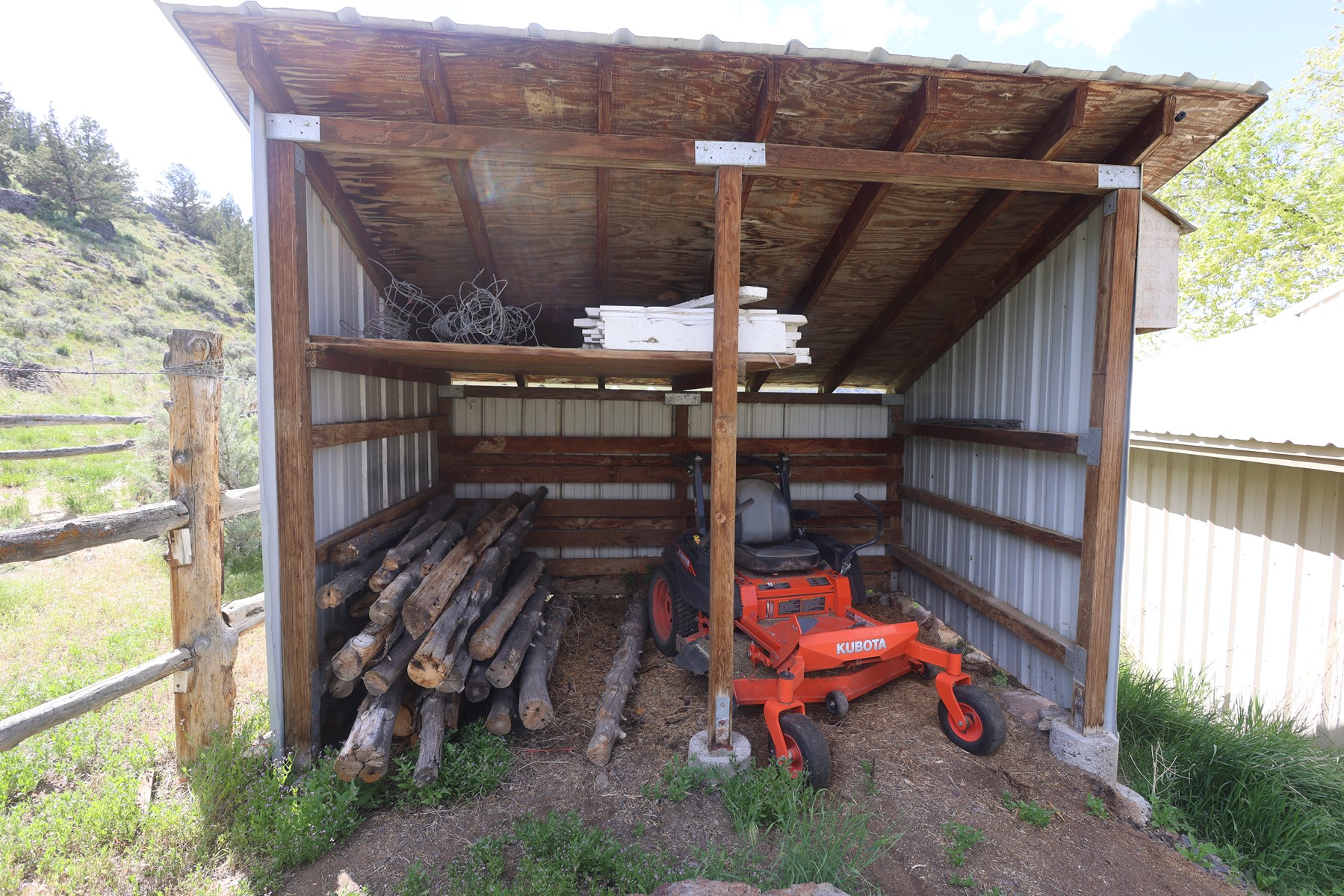 • Centrally located on the premises is a 576 sq ft hay cover, also used as storage cover but could be useful for hay storage.  Built as a pole barn with a metal roof, it has tall ceilings to utilize more storage.