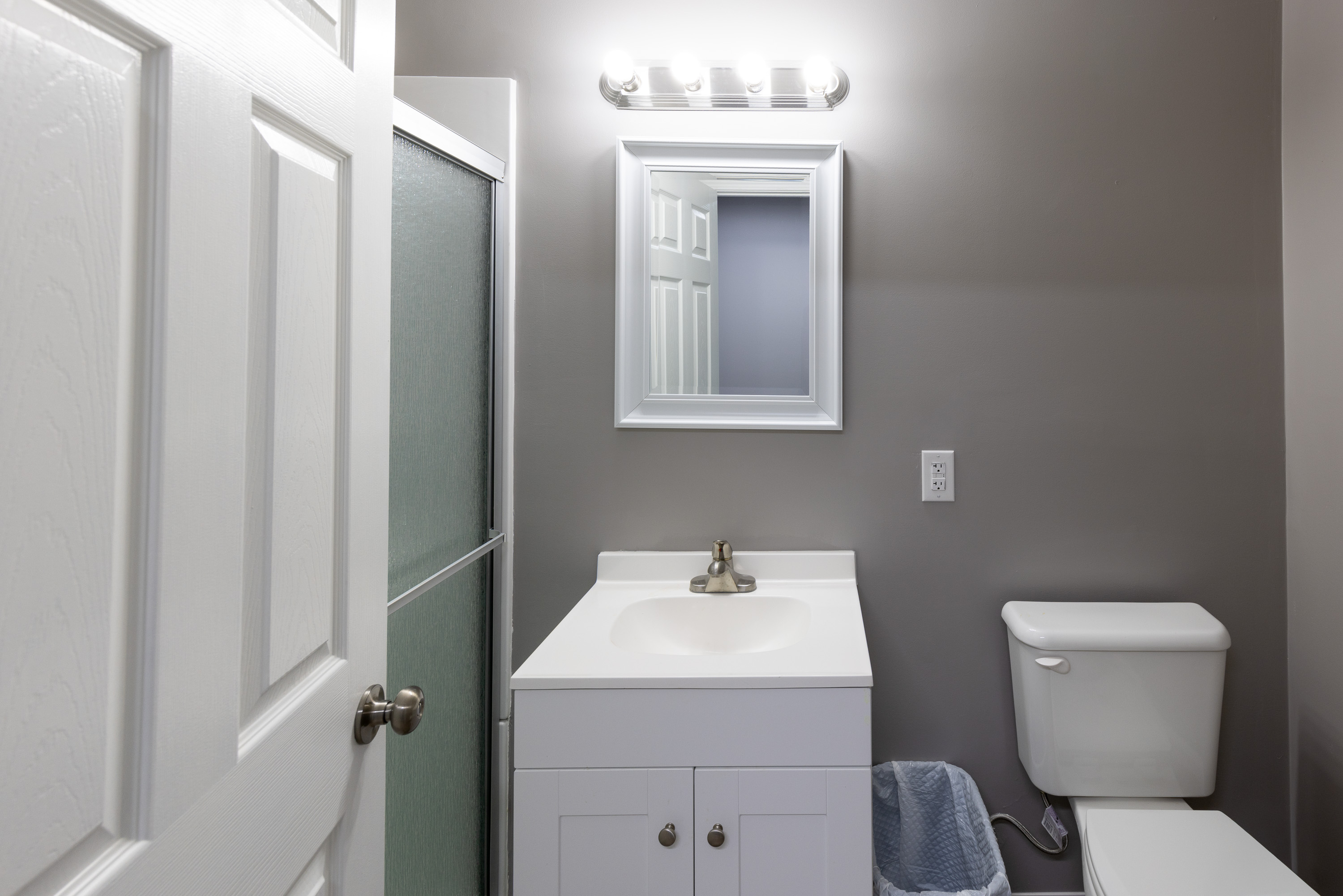 Two full bathrooms with single-vanity sinks and fiberglass shower stalls